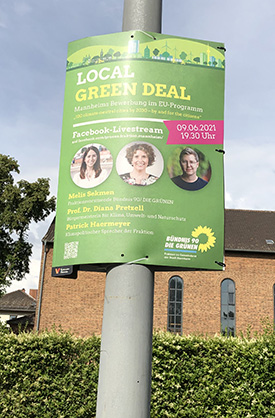 30.06.2021Anfang Juni fand ein Facebook-Livestream der Grünen Fraktion in Mannheim zu Bewerbung Mannheims im EU-Programm "Local Green Deal" statt. Mit dem gedruckten Plakat hat man die digitale Veranstaltung auch analog beworben. Like it. Hier in Neckarau vor der Markuskirche.