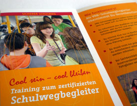 31.03.2009Der aktuelle Folder "Training zum zertifizierten Schulwegbegleiter" des VRN ist erschienen. Unter Anleitung einer Mediatorin können sich Schülerinnen und Schüler zu Schulwegbegleitern ausbilden lassen. In der Ausbildung lernen die Schulwegbegleiter "durch Gespräche zu überzeugen, Körpersprache richtig einzusetzen, selbstbewusst aufzutreten, kritische Situationen zu erkennen und richtig einzuschätzen, mit Konflikten umzugehen, auf Provokationen cool zu reagieren, Hilfe anzubieten & in brenzligen Situationen zu vermitteln."