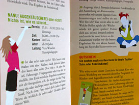 28.07.2009Das neue Halbjahres-Programm der Jugendkunstschule unARTig des Ludwigshafener Kunstvereins ist erschienen. Das Programm ist wieder voll mit wunderbaren Kursen für Kinder und Jugendliche. Man wünschte, man wäre wieder 12. Die Illustrationen kommen mir zeitlos schön vor. (Ja, ja ich weiß, Eigenlob stinkt.) Im übrigen auch ein schönes Geschenk für die Töchter, Söhne und Enkel: ein Kurs im Kunstverein. Inzwischen gibt es dazu auch den passenden Gutschein.