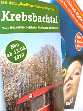 10.06.2010In dieser Woche sind gleich zwei Broschüren des VRN erschienen. Im Krebsbachtal lässt der VRN einen historischen Schienenbus wieder auferstehen und erfreut damit nicht nur "Pufferküsser". Zwischen Juni und Oktober verkehrt der Uerdinger Schienenbus zwischen Neckarbischofsheim und Hüffenhardt.