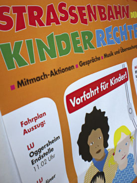 27.10.2010Am 20. November 2010 haben sich die Städte Mannheim und Ludwgshafen wieder zu einer Aktion für die Kinderrechte zusammengetan. In diesem Jahr wird eine "Kinderrechte-Straßenbahn" zwischen beiden Städten hin und her und rundherum fahren. In der Bahn und an den Wendeschleifen werden viele spannende Mitmach-Aktionen angeboten, die Fahrt und Teilnahme ist für die Kinder kostenfrei. Der Leporello enthält einen genauen Fahr- und Streckenplan sowie Informationen zu den jeweiligen Aktionen. Mir hat es Spaß gemacht, mal wieder zu zeichnen...