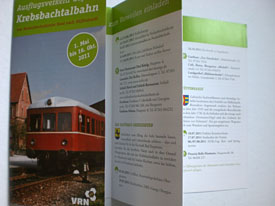 01.05.2011Auch in diesem Jahr fährt wieder die Krebsbachtalbahn durchs schöne Tal. Vom 1. Mai bis zum 16. Oktober kann man in Neckarbischofsheim einsteigen und mit einer historischen Bahn bis nach Hüffenhardt fahren. Im diesjährigen 10-seitigen Flyer sind neben dem Fahrplan auch Einkehrtipps und Feste der Region aufgeführt, so dass sich ein Ausflug auch für Nicht-Pufferküsser lohnt.