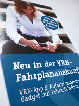 02.05.2011Was rede ich? Die ich keine Ahnung habe von Apps und Gadget und Echtzeitauskunft – das alles ist durchaus eine schöne Sache. Ich habe es mit eigenen Augen gesehen und einen Flyer zum Thema produziert. Der VRN bietet eine VRN-App und einen Abfahrtsmonitor als Gadget mit Echtzeitinformation. Die App kann auch überregionale Verbindungen suchen und wer mit dem ÖPNV unterwegs ist, sollte sich das Teilchen installieren.