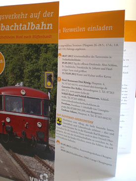 12.03.2012Auch in diesem Jahr fährt wieder die historische Krebsbachtalbahn und zwar ab dem 1. Mai bis zum 21. Oktober. Fahrplan und Sehenswertes an der Strecke, auch Einkehrmöglichkeiten werden im gerade neu aufgelegten Flyer aufgeführt. Den Flyer kann man auch auf der VRN-Webseite runterladen. (www.vrn.de/vrn/service/medien/informationsbroschueren/index.html)